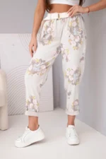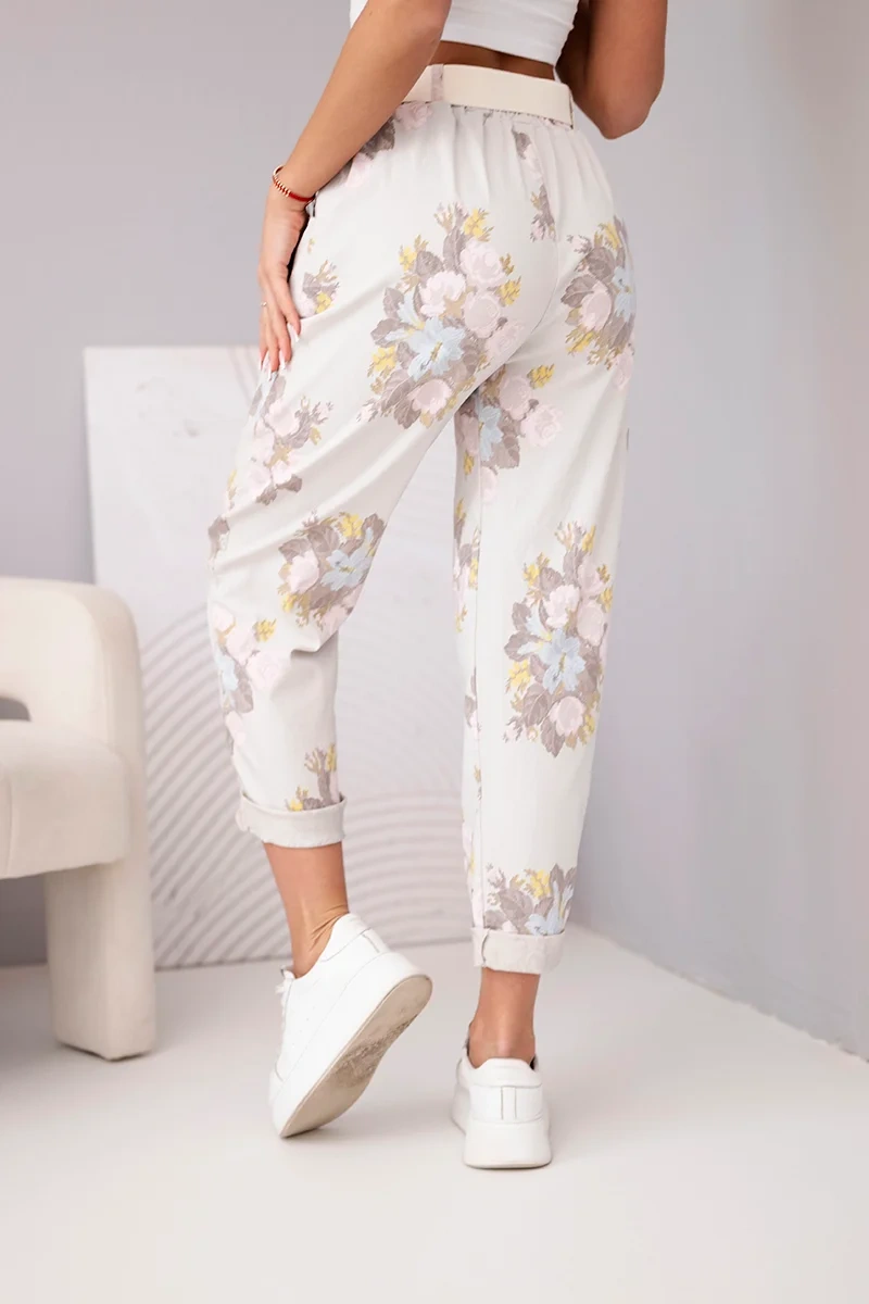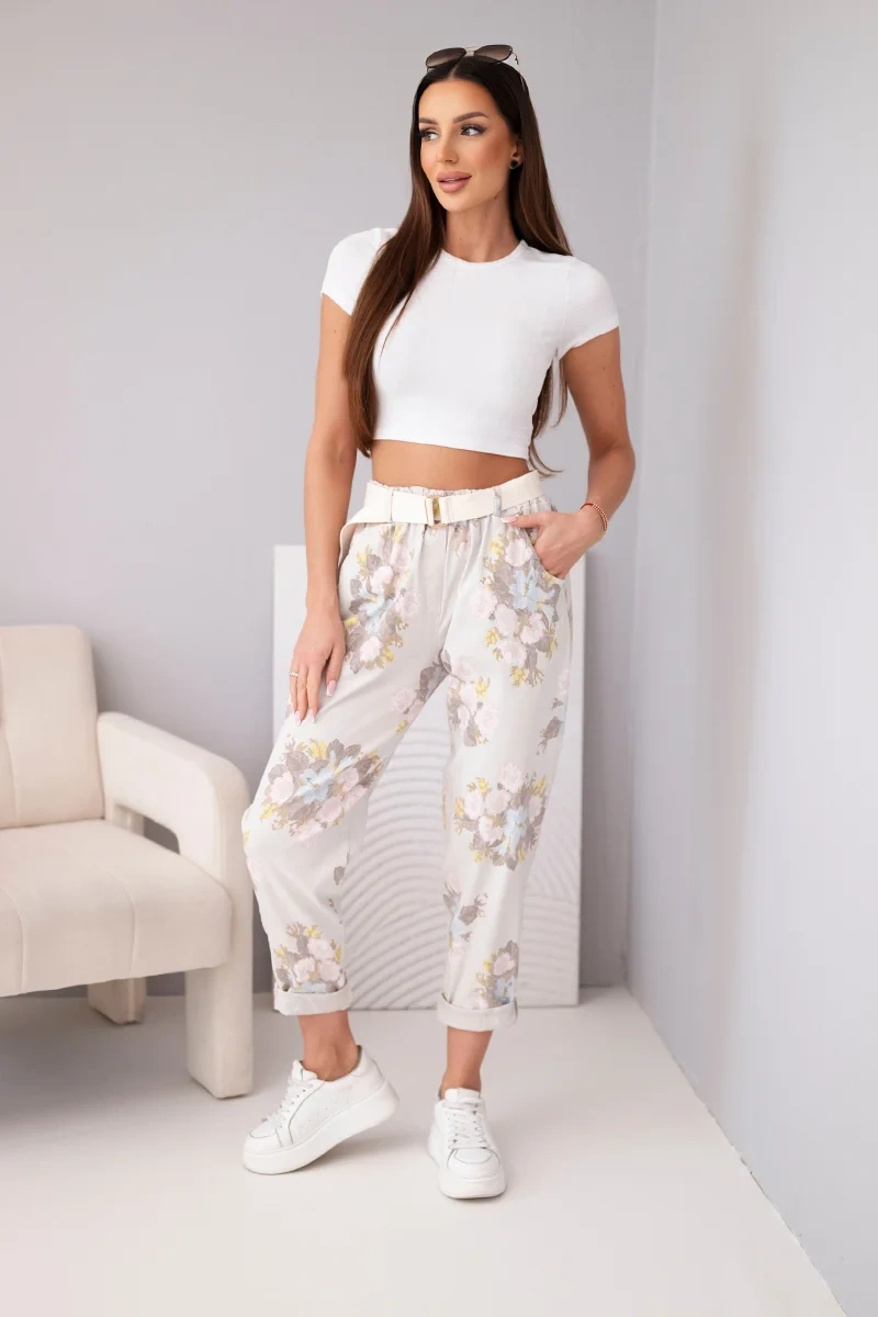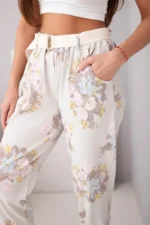 Spodnie damskie wiskozowe w kwiaty z paskiem beżowe