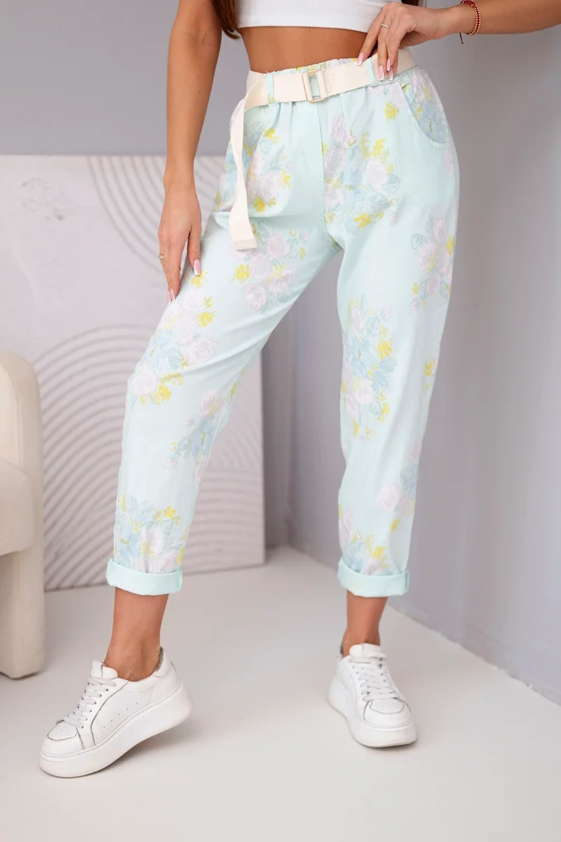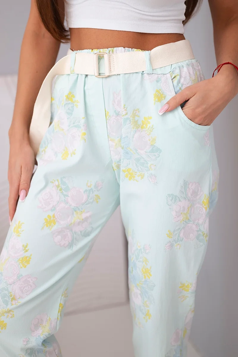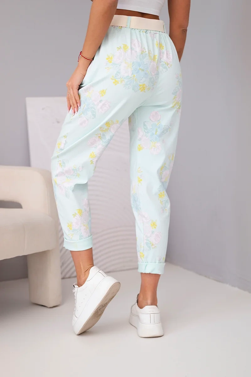 Spodnie damskie wiskozowe w kwiaty z paskiem miętowe