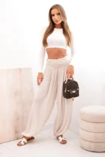 - Detale: delikatne marszczenia, zakończenia nogawek z gumką