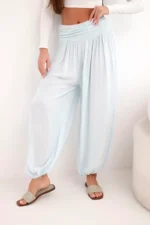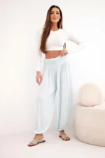Te wyjątkowe spodnie damskie z szeroką nogawką i subtelnymi marszczeniami to idealna propozycja na co dzień i nie tylko. Wykonane w 100% z miękkiej wiskozy, gwarantują lekkość i przyjemność noszenia nawet w cieplejsze dni. Elastyczny pas zapewnia komfort i doskonałe dopasowanie, a luźny krój daje swobodę ruchów i modny wygląd. Model zakończony gumką u dołu nogawek nadaje spodniom unikalny charakter i delikatnie podkreśla sylwetkę. To świetny wybór na spacer, zakupy, wyjazd czy relaks w domowym zaciszu. Dzięki prostemu fasonowi i neutralnej kolorystyce łatwo dopasujesz je do różnych stylizacji – od sportowych po casualowe. Rozmiar jest uniwersalny i będzie odpowiedni dla Pań w rozmiarze S, M lub L.