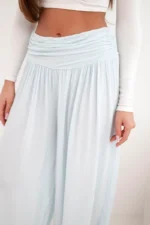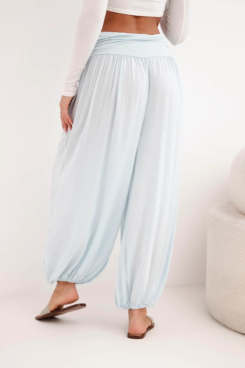 Spodnie damskie wiskozowe z szeroką nogawką i marszczeniami niebieskie
