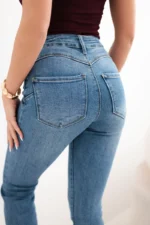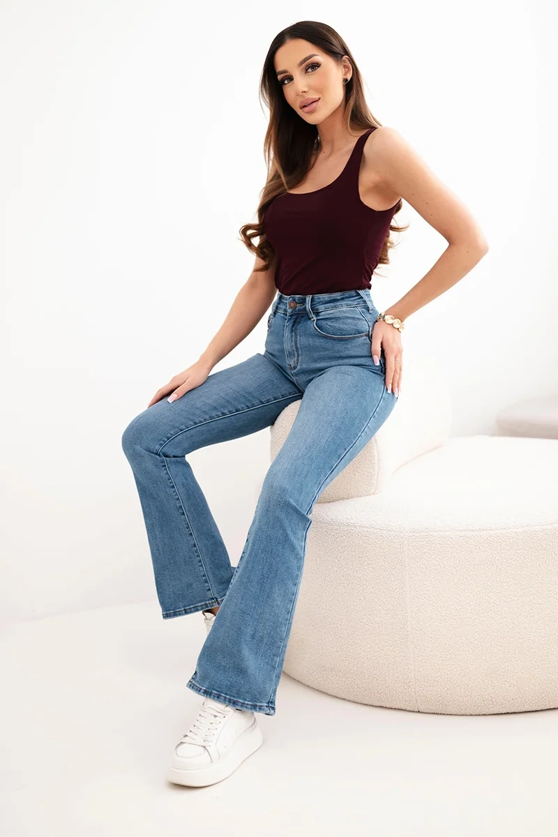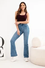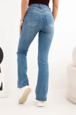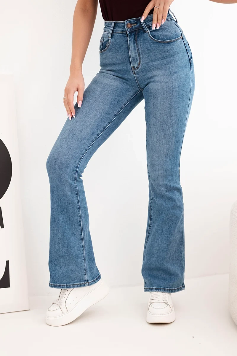 Stylowe jeansy damskie z rozszerzaną nogawką to doskonała propozycja dla kobiet, które cenią sobie modne fasony i wygodę na co dzień. Model z wysokim stanem pięknie podkreśla talię oraz optycznie wydłuża nogi, nadając sylwetce proporcji. Delikatnie dopasowana góra i efektownie rozszerzana nogawka w stylu flare sprawiają, że spodnie świetnie wpisują się w aktualne trendy modowe.