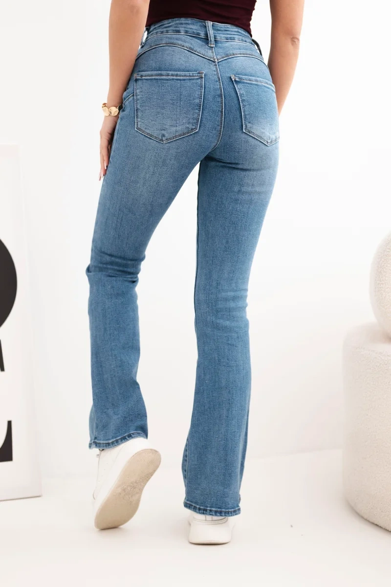 Cechą charakterystyczną modelu jest klasyczne zapięcie na guzik i suwak, praktyczne kieszenie z przodu i z tyłu oraz modnie rozszerzana nogawka, która nadaje całości kobiecego charakteru. Elastyczny materiał dopasowuje się do sylwetki, zapewniając swobodę ruchów przez cały dzień.