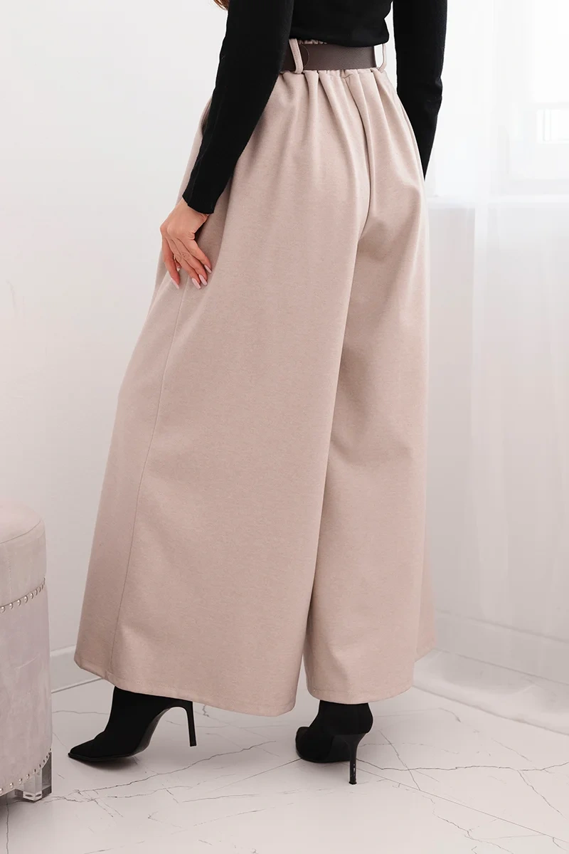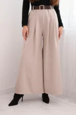 Dodatkowym atutem jest szeroki pasek z klamrą w zestawie, który podkreśla talię i dodaje stylizacji modnego akcentu. Spodnie posiadają eleganckie zakładki z przodu, co nadaje im bardziej dopracowany wygląd – świetnie sprawdzą się zarówno na co dzień, jak i do pracy czy spotkania biznesowe.