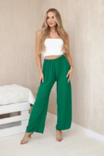 Spodnie z szeroką nogawką to wyjątkowy element garderoby, który łączy w sobie komfort i elegancję. Wykonane z lekkiego i przewiewnego materiału, te spodnie gwarantują nie tylko swobodę ruchów, ale także zapewniają uczucie lekkości i świeżości przez cały dzień. Szeroka nogawka nadaje spodniom charakterystyczny, luźny fason, który jest zarówno modny, jak i wygodny. Ten element sprawia, że spodnie prezentują się niezwykle stylowo i efektownie, dodając oryginalności każdej stylizacji. Uniwersalny design spodni z szeroką nogawką sprawia, że doskonale pasują one do różnych okazji i stylizacji. Możesz nosić je zarówno do codziennych, luzackich outfitów, jak i do bardziej eleganckich zestawów na spotkania biznesowe czy wieczorne wyjścia. Spodnie z szeroką nogawką to idealny wybór dla kobiet, które cenią sobie wygodę i styl. Dzięki swojemu uniwersalnemu designowi i wysokiej jakości wykonania, te spodnie stanowią niezastąpiony element garderoby, który świetnie uzupełni każdą kolekcję ubrań. Rozmiar jest uniwersalny i będzie odpowiedni dla Pań noszących rozmiar  S, M lub L.