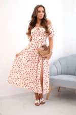 Dekolt w stylu hiszpańskim z subtelnym wiązaniem podkreśla kobiecość i dodaje uroku, a krótkie bufiaste rękawy nadają całości delikatności. Dopasowana talia świetnie akcentuje figurę, a rozkloszowany dół dodaje lekkości i swobody ruchów. To idealna propozycja dla kobiet ceniących styl i komfort.