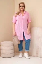 Sukienka damska Plus Size z haftem i podwijanym rękawem jasno różowa