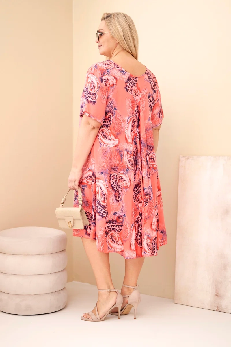 Sukienka posiada klasyczny, zaokrąglony dekolt oraz krótkie rękawy, które zapewniają lekkość i przewiewność. Oryginalny wzór paisley nadaje całości modnego i wyjątkowego charakteru, dzięki czemu model przyciąga wzrok i wyróżnia się w stylizacjach. Rozszerzany dół sprawia, że sukienka pięknie się układa i daje poczucie swobody ruchów.