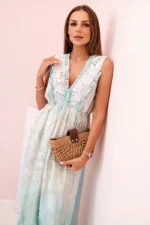 Jeśli szukasz sukienki idealnej na letnie dni, ta sukienka damska maxi z haftem i głębokim dekoltem to doskonały wybór. Zwiewny fason z lekkiej wiskozy pięknie układa się na sylwetce i zapewnia maksymalny komfort nawet w upalne dni. Haftowane zdobienia na dekolcie nadają jej boho charakteru, a elastyczna talia podkreśla kobiecą figurę. Ten model świetnie sprawdzi się zarówno na wakacjach, spacerach po plaży, jak i podczas letnich imprez czy garden party. Dzięki wyjątkowemu designowi z modnymi, romantycznymi akcentami, sukienka przyciąga wzrok i dodaje lekkości każdej stylizacji. Rozmiar jest uniwersalny i będzie odpowiedni dla Pań w rozmiarze S, M lub L.
