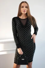 Czarna sukienka dzianinowa z ozdobnym wzorem z cyrkonii to perfekcyjne połączenie elegancji i wyrazistego designu. Dzianinowy materiał gwarantuje wygodę noszenia, jednocześnie podkreślając kobiecą sylwetkę. Ozdobny wzór z cyrkonii dodaje sukience subtelnego blasku i oryginalności. To efektowny detal, który przyciąga uwagę i nadaje sukience wyjątkowego charakteru. Cyrkonie nadają dodatkowego uroku, tworząc efekt subtelnej elegancji. Czarny kolor sukienki stanowi doskonałą bazę dla ozdobnego wzoru, umożliwiając mu wyraźne i stylowe wyeksponowanie. To sukienka, która sprawdzi się zarówno na wieczorne wyjścia, imprezy, jak i na bardziej formalne okazje. Bądź gotowa na elegancję z nutą blasku z naszą czarną sukienką dzianinową z ozdobnym wzorem z cyrkonii. To połączenie stylu, komfortu i wyjątkowego designu, które pozwoli Ci zabłysnąć w każdej sytuacji. Rozmiar jest uniwersalny i będzie odpowiedni dla Pań noszących rozmiar S, M lub L.