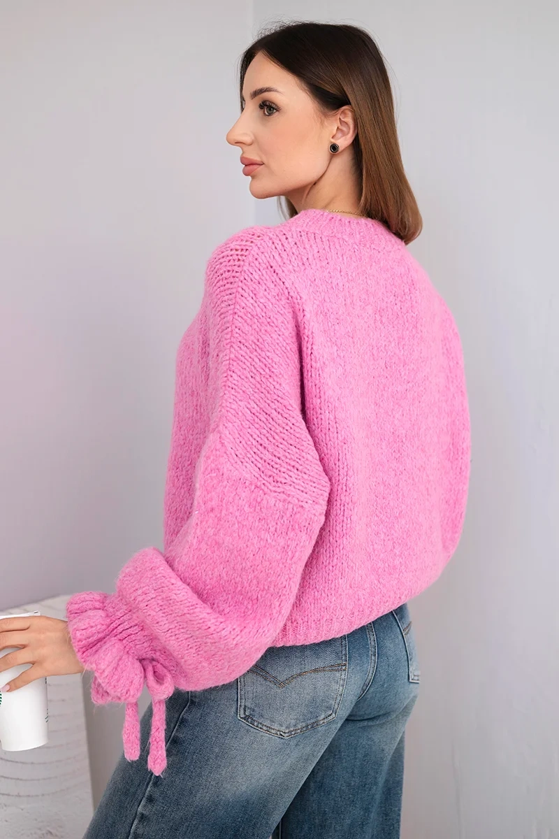 Ten sweter damski z grubym splotem to idealny wybór na chłodniejsze dni. Wyróżnia się stylowym, oversize’owym krojem oraz uroczymi detalami przy rękawach w formie supłów, które dodają mu charakteru. Dzięki swojej miękkiej i puszystej fakturze zapewnia nie tylko modny wygląd, ale także komfort noszenia na co dzień.